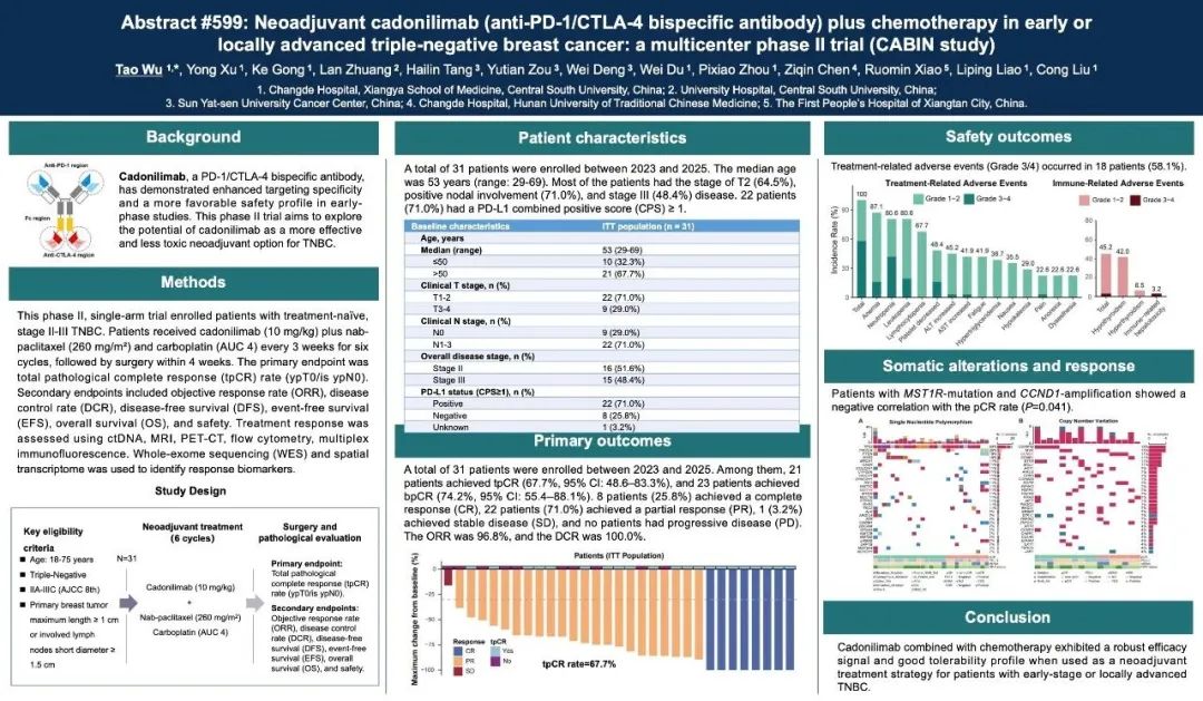 2025年5月30日-6月3日,美国临床肿瘤学会(ASCO)年会顺利召开,医学界的目光再次聚焦于这一全球瞩目的科研学术盛会。据悉,常德市第一人民医院吴涛教授及团队开展的“单臂、Ⅱ期 CABIN研究:卡度尼利单抗(抗PD-1/CTLA-4双特异性抗体)联合化疗新辅助治疗早期或局部晚期三阴性乳腺癌(TNBC)”被ASCO入选为壁报展示(Poster Session),这无疑是大会官方对该研究初步结果的一致认可。值此之际,我们有幸在ASCO年会现场邀请到吴涛教授,就CABIN研究及其在TNBC治疗领域的意义进行深入访谈。